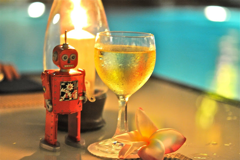 it seems that people will tolerate and even be charmed by your madness if you've already established yourself with them. like by hanging out for endless hours every evening at the pool and eating dinner at their restaurant several two nights in a row. so that they kinda know you and your proclivity for ordering a fruit plate with only dragon fruit. because the child does so adore dragon fruit. so when you come with a little bag containing your nikon, a magazine and yes, a little red robot of which you may have bought two three four different models (because husband says you need a critical mass of something in order to have a collection (tidy little blame assessment there, eh?)). and although it's really quite dark, you are attempting to photograph your robot, and then there's that thing where you really hate to use the flash, so you don't. and then the staff begins to assist, by suggesting new places where the robot would look fetching. like next to the candle and your wine. with the pool in the background. and a lovely flower that had fallen from one of the nearby trees.
