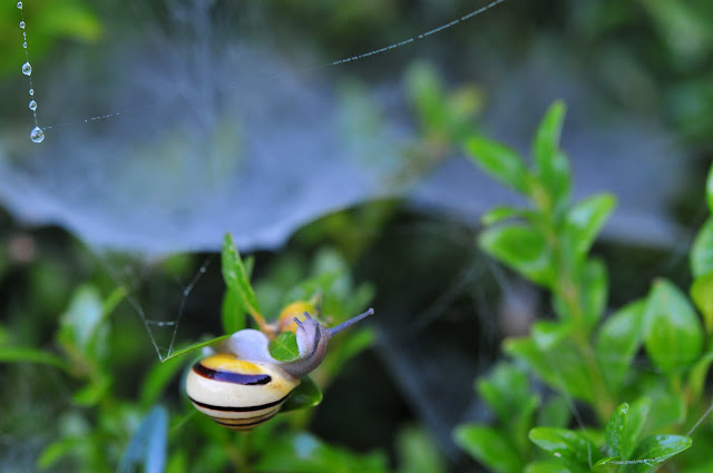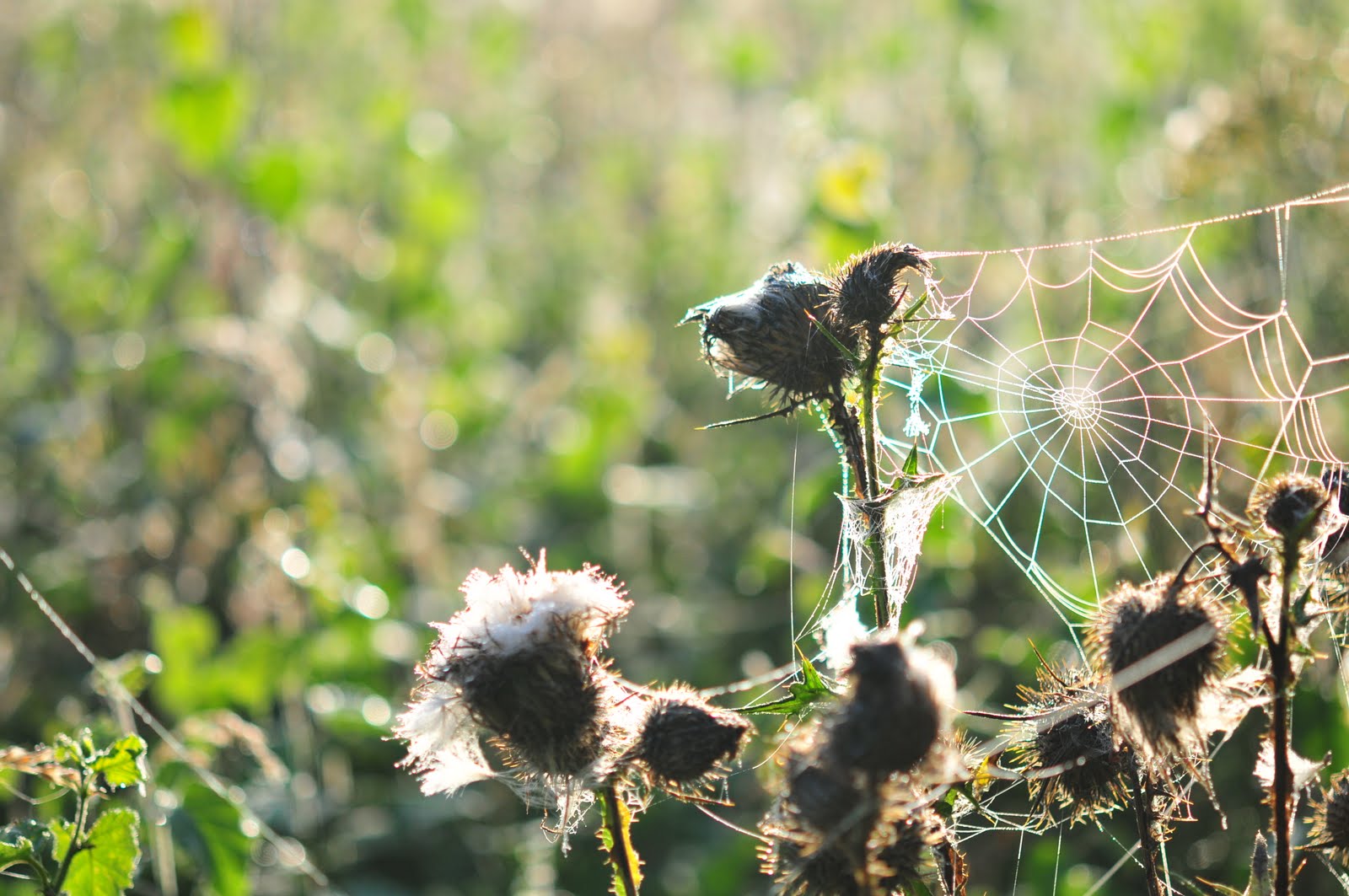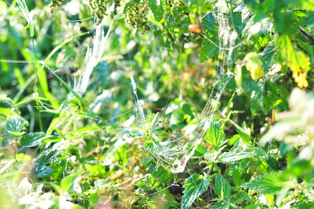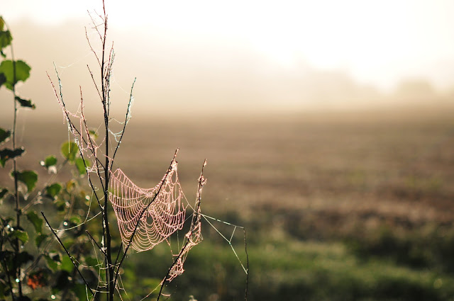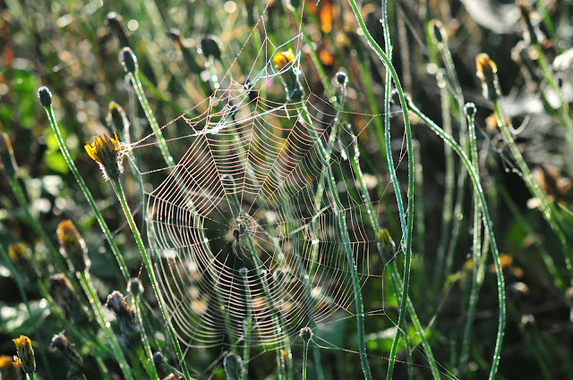 dew-laden spiderwebs sparkling in the morning sun.