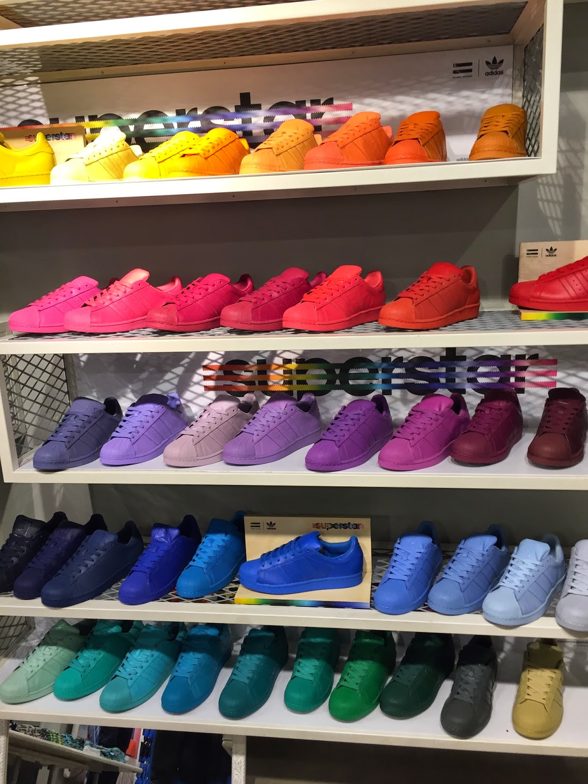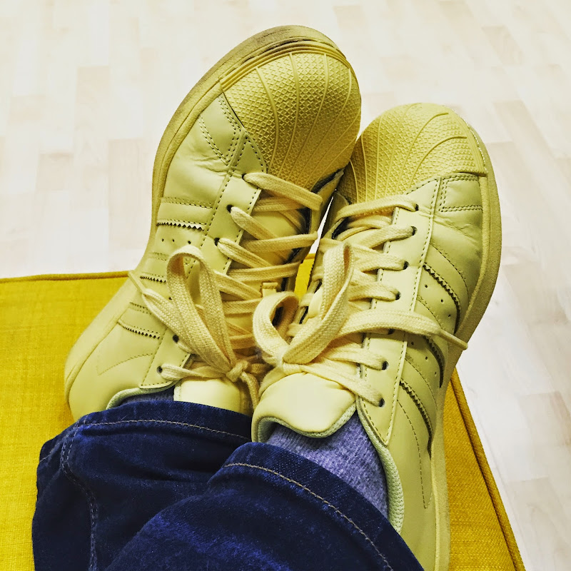 we'd been looking everywhere, but finally, in the adidas store in copenhagen, we got to see all. the. colors. the awesome adidas supercolor superstars make you think you probably need them all. but at 50 x 700 kroner, that would be quite an investment. i got yellow and sabin got purple. she would have chosen light blue, but they were out of her size. we will probably have to go back. one pair just isn't enough.