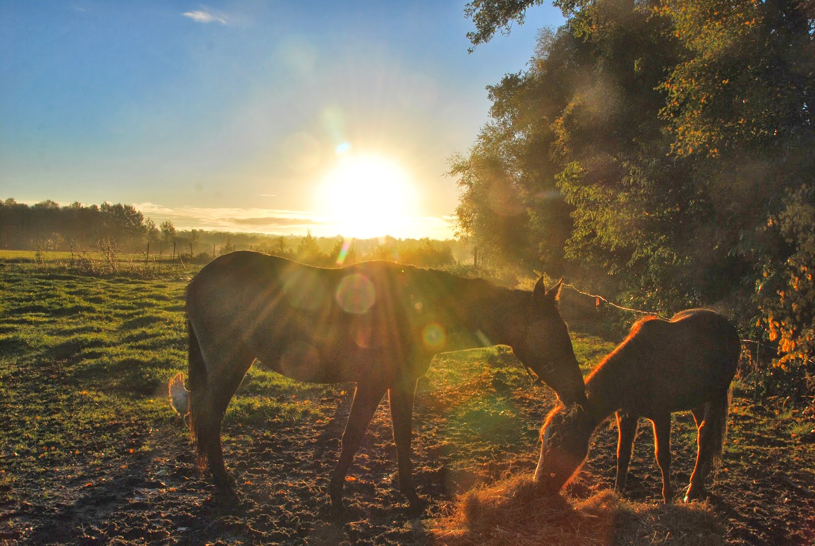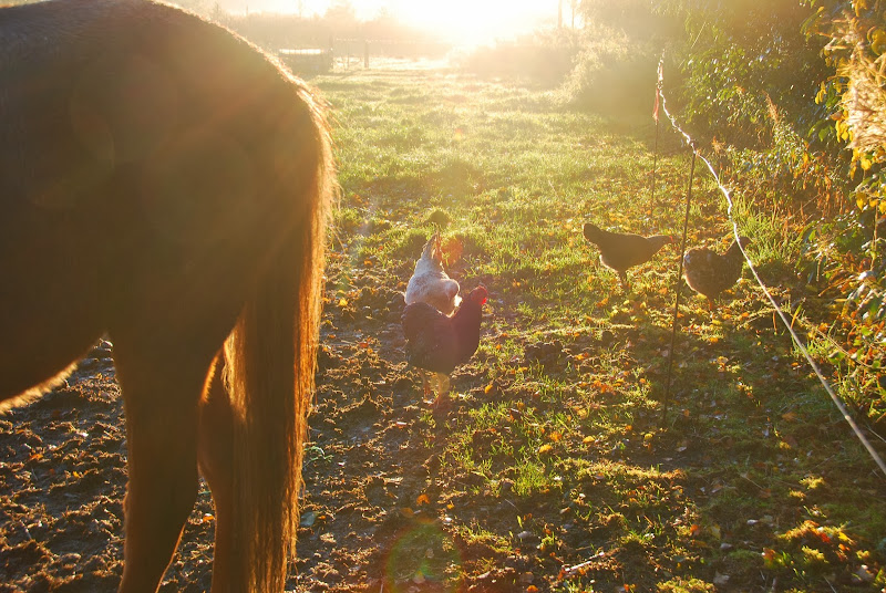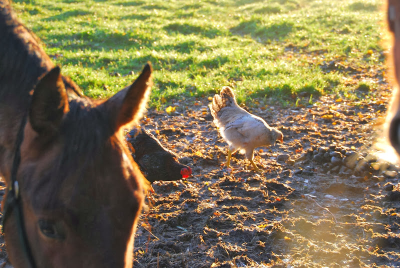 the chickens love hanging out near the horses.