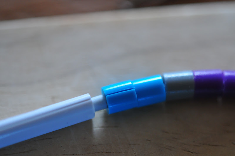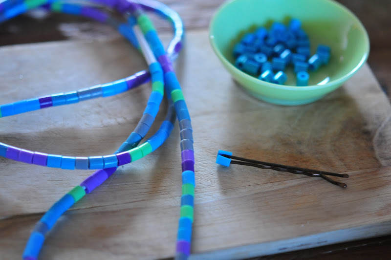 what takes the longest is sorting and cutting each bead - with the bobby pin technique, it only took about half an hour to actually put them all on the cord. it looks cool, protects the cord and makes it much harder for it to tangle up. plus, we can tell whose is whose at our house now. sadly, husband won't let us do his, even tho' we promised to choose boy colors.