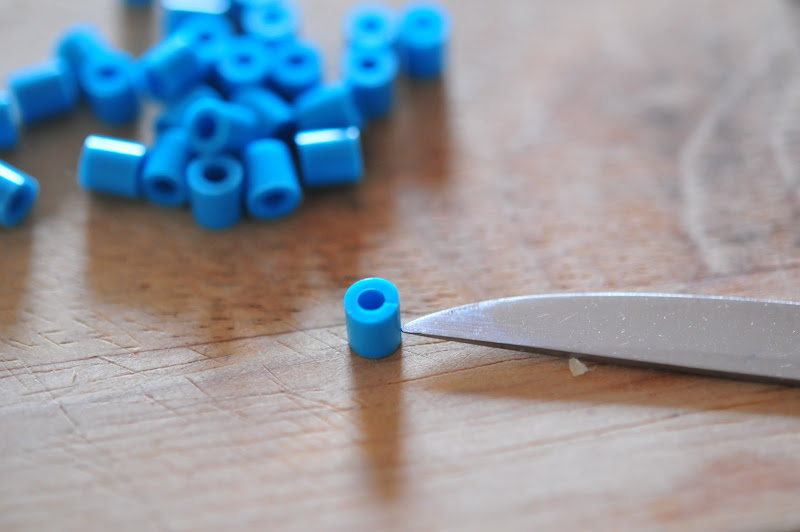 then we took a sharp, small knife and carefully made a cut on one side of each bead. we tried to do it with nail scissors, but found that our thumb and forefinger quickly became too sore for that. a knife and a small cutting board were much better.