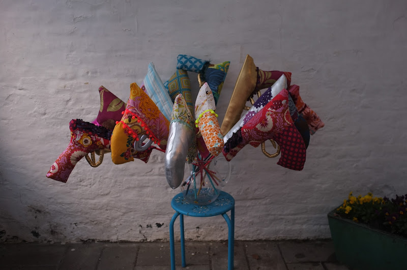 soft guns. in light of police shootings and folks murdering one another daily with guns in the united states, what could be more paradoxical than a set of cuddly guns? especially ones with happy, cheerful, bright flags extending from them, cartoon gun style? these were my contribution to our spring exhibition in creagive, our local group of creative souls.