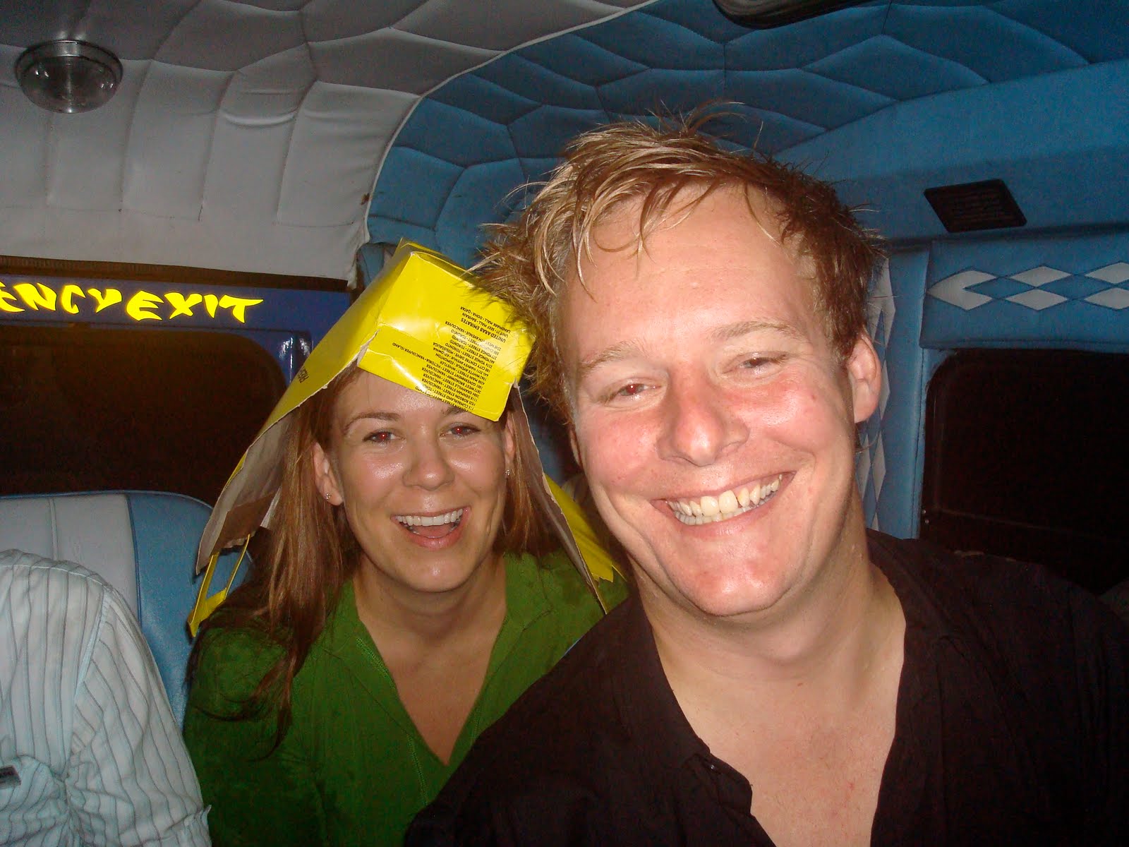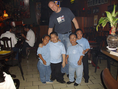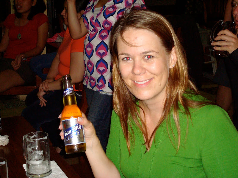 we got ready for dinner and ran for the bus. my sister used a very environmentally conscious rain hat which she had made from a lush bag - lush being pretty environmentally conscious themselves. we had a nice dinner, some karaoke and a few beers. san miguel light and san miguel extra dry were our beers of choice in the philippines. very refreshing, as my red-eyed sister illustrates (these were taken before i got the "big" camera).