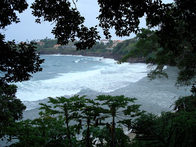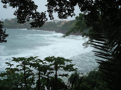 however, the now smaller group of three (of the fond memories) decided to brave the steps down to the beach, where the waves were pounding in. the water was warm and wild and they laughed and laughed and shouted into the wind. it made them feel very alive, being there in that place, experiencing that storm up close. the waves were so wild that they were soon covered in sand and their towels, which had been left on the stairs were swept away. one of the three, uncomfortable with all of the sand that had filled his swimming trunks, took them off. and it was only discovered some time later that they too were swept away. along with his glasses. eventually, they began to feel they had sand in places it shouldn't be (ears, for example) and it began to seem dangerous and foolhardy, so the trio made their way back to the bungalows. one of them now stark naked and without his keycard.
