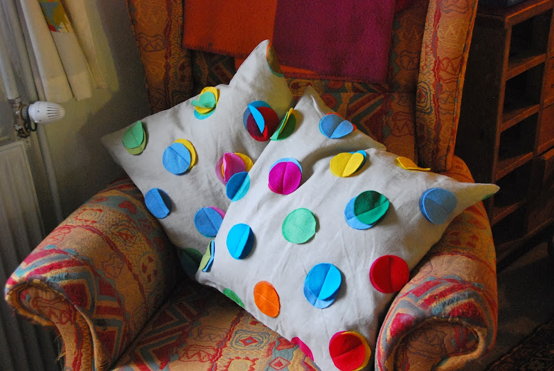 and to sort of smooth over my earlier ranty post, i thought i'd share something bright and cheery. i had some fun embellishing some ikea pillow covers for the big girls for christmas and now i can share them, since they've been given. i added felt circles to these simple linen covers for k's couch at her new apartment. the pillows have colorful printed circles on them already, which i just covered with the felt, sewing a simple line down the middle, so they have a bit of dimension to them.