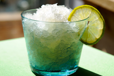 i let mine freeze overnight, but it likely would have been ready sooner--the gin keeps it from freezing into ice cube-like consistency. then, you take a fork and rake it across until it's a lovely slushy consistency, put it in a glass with a slice of lime and serve in the sun.
