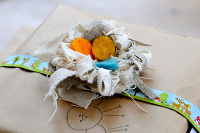 36 - hand-stamped ribbon for wrapping the above gift. sabin actually carved the little owl stamp from an eraser and i did the stamping.