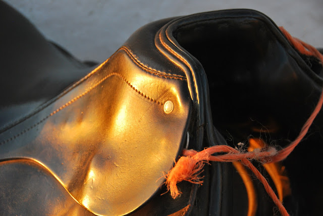 case in point:  some months ago, when our horse was still stabled over at our neighbors' place, they offered that we could have a look at some of their old saddles and try them out and see if one would fit matilde. so recently, i went over and took a couple of the saddles to try. they were up on the highest pegs in the tack room, dusty and obviously unused for years, even a little bit musty-smelling. they're good brands and were very nice saddles when they were new, but both are, shall we say...well broken-in and probably at least 20 years old. i actually didn't mind, as they still have a lot of good left in them and i figured that it would mean that they would be in an affordable price range.