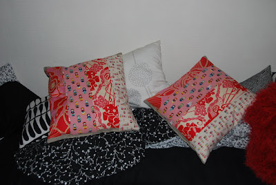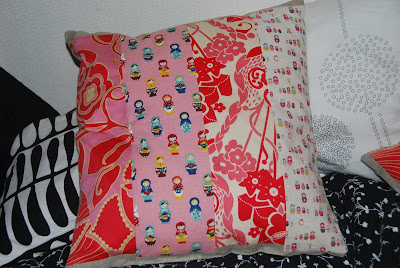 working with mathilde (husband's middle daughter), we made two pillows for her bedroom, using some cute japanese matrioshka fabric (the fabric is japanese, not the matrioshki, they're russian) from etsy (which can't be linked to at the moment due to scheduled maintenance) and a couple of lush anna maria horner fabrics.