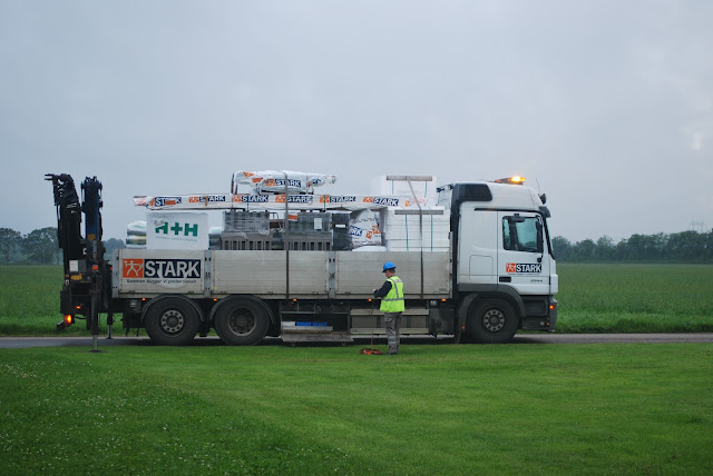 and big trucks delivering materials.