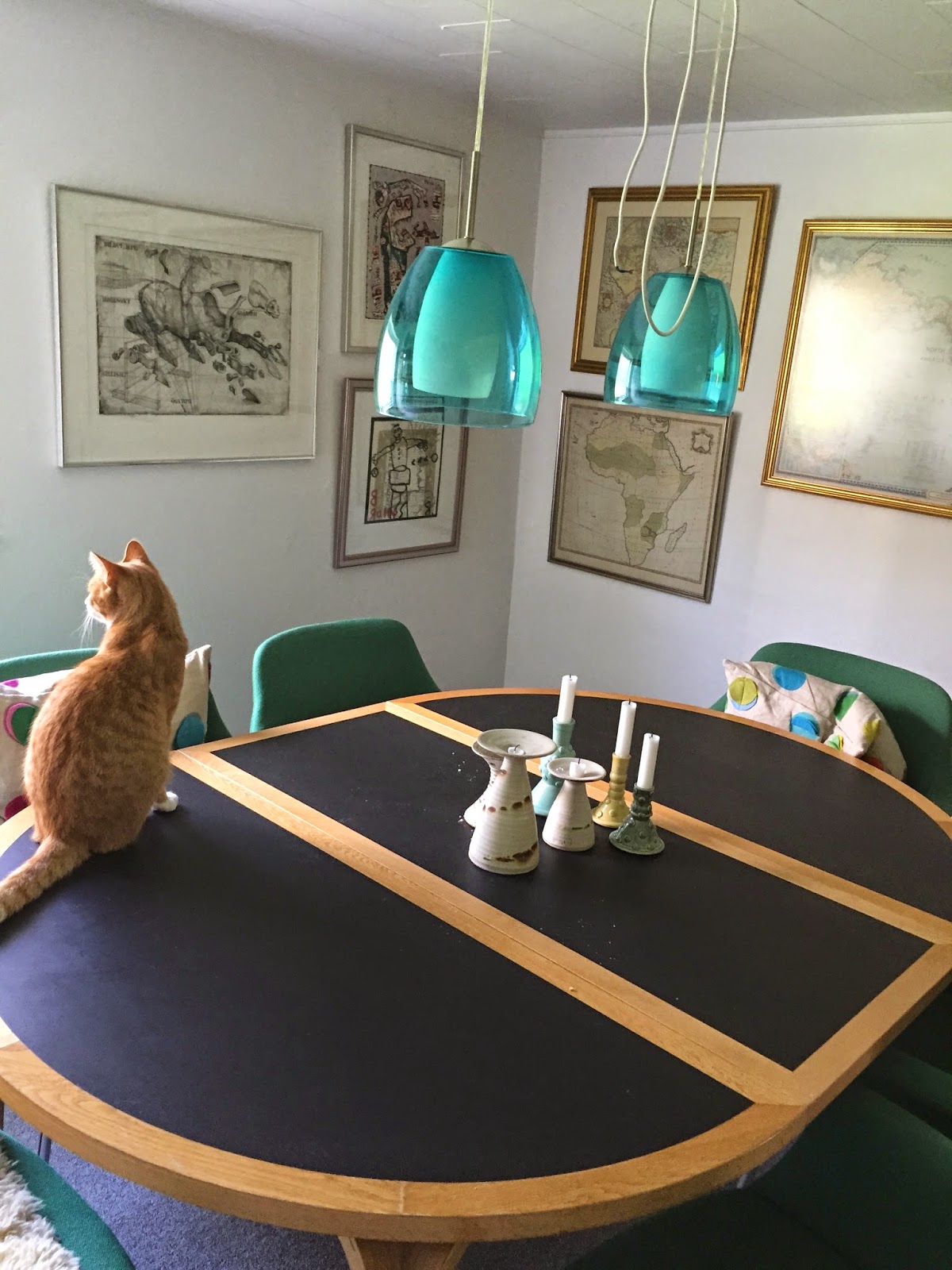 we scored some awesome green wool-covered chairs and a pretty cool round table, with leaves, at the recent flea market at our local kulturhus. and they are going to be our dining set, since our other table is far too large.