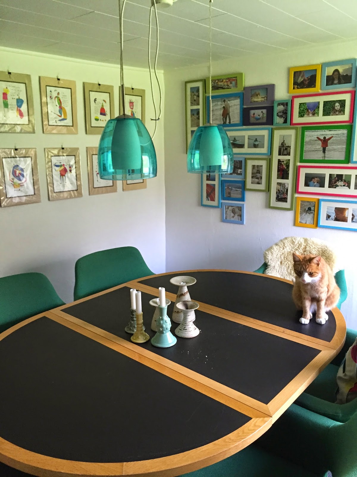 yes, those are breakfast crumbs on the table. but hey, there's also a cat on the table that apparently didn't get the memo about "no cats on the table." what was most fun about setting up the room (because i got home in time to help), was digging out all of our old photos, which used to line the stairs back on poppelvej and hanging them on the wall. i changed a few out, but mostly, i left them, for the sake of the memories. fresh, white walls and loads of meaningful pictures make for a lovely space, even tho' the ceiling is low and we're waiting for the electrician to come and deal with that light fixture (we thought it didn't work, but husband got zapped, so it apparently does).