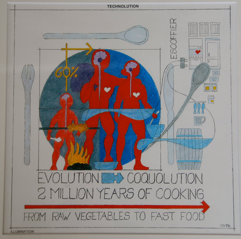 a number of years ago, when my father-in-law was still alive, i sent him an article from the new york times on how cooking had pushed evolution. he was the inventor and first professor of technolution, the study of how technologies have pushed evolution, so i always had an eye out for articles and books that explored such themes. his thinking about the article resulted in the illumination above, which hangs in my kitchen, right near my stove. peter had developed a pictorial language through which he expressed the concepts. all of the drawings have human figures and a circle within a square inspired by davinci's vetruvian man.