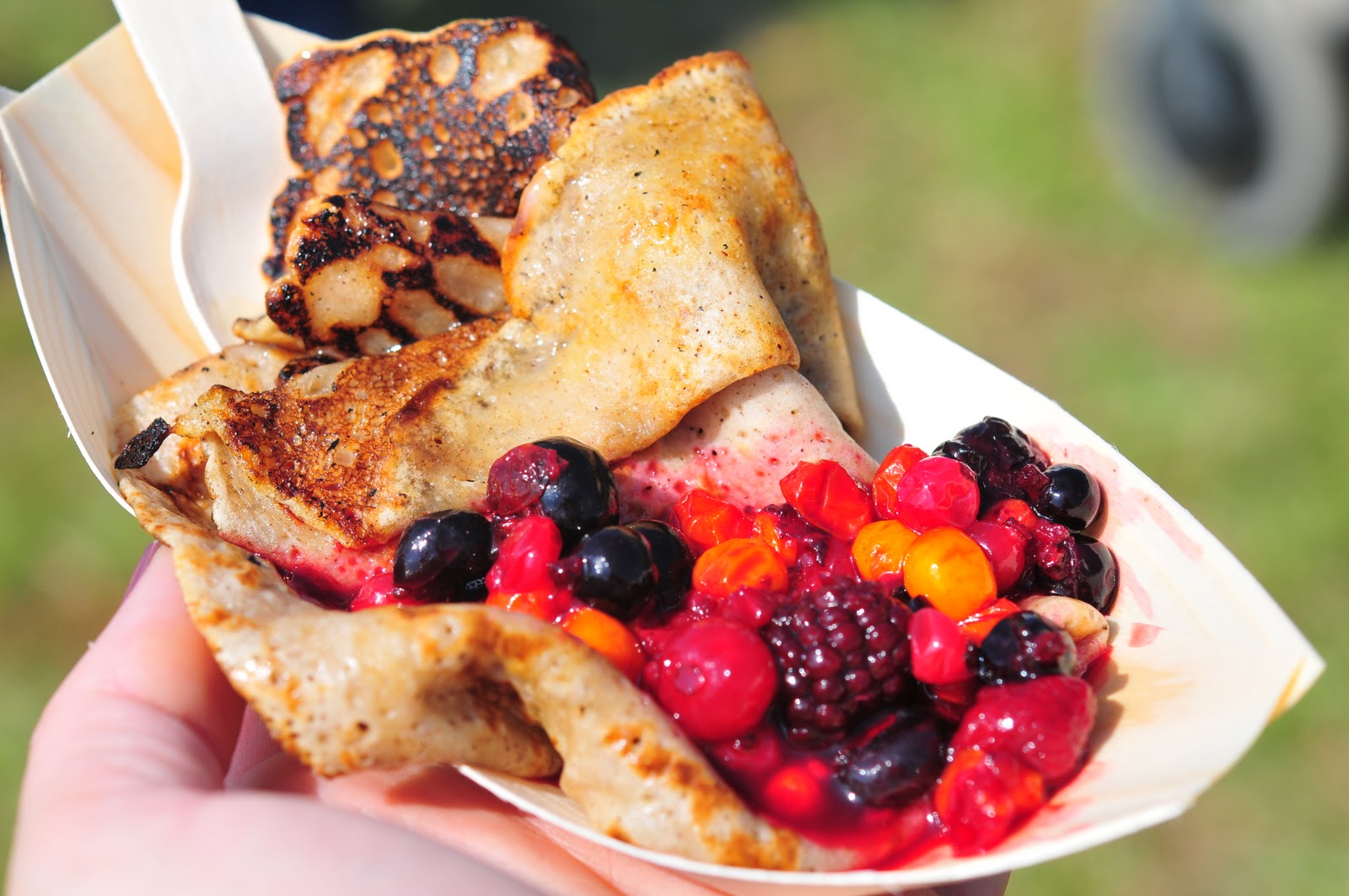 | mmm, food fit for a viking - a pancake with tart forest berries, served in a smart, environmentally-friendly wooden bowl with wooden fork. |