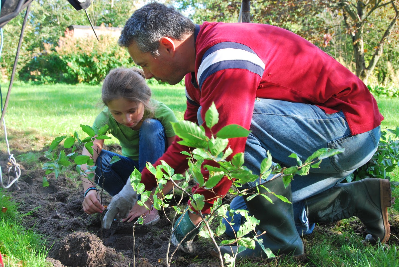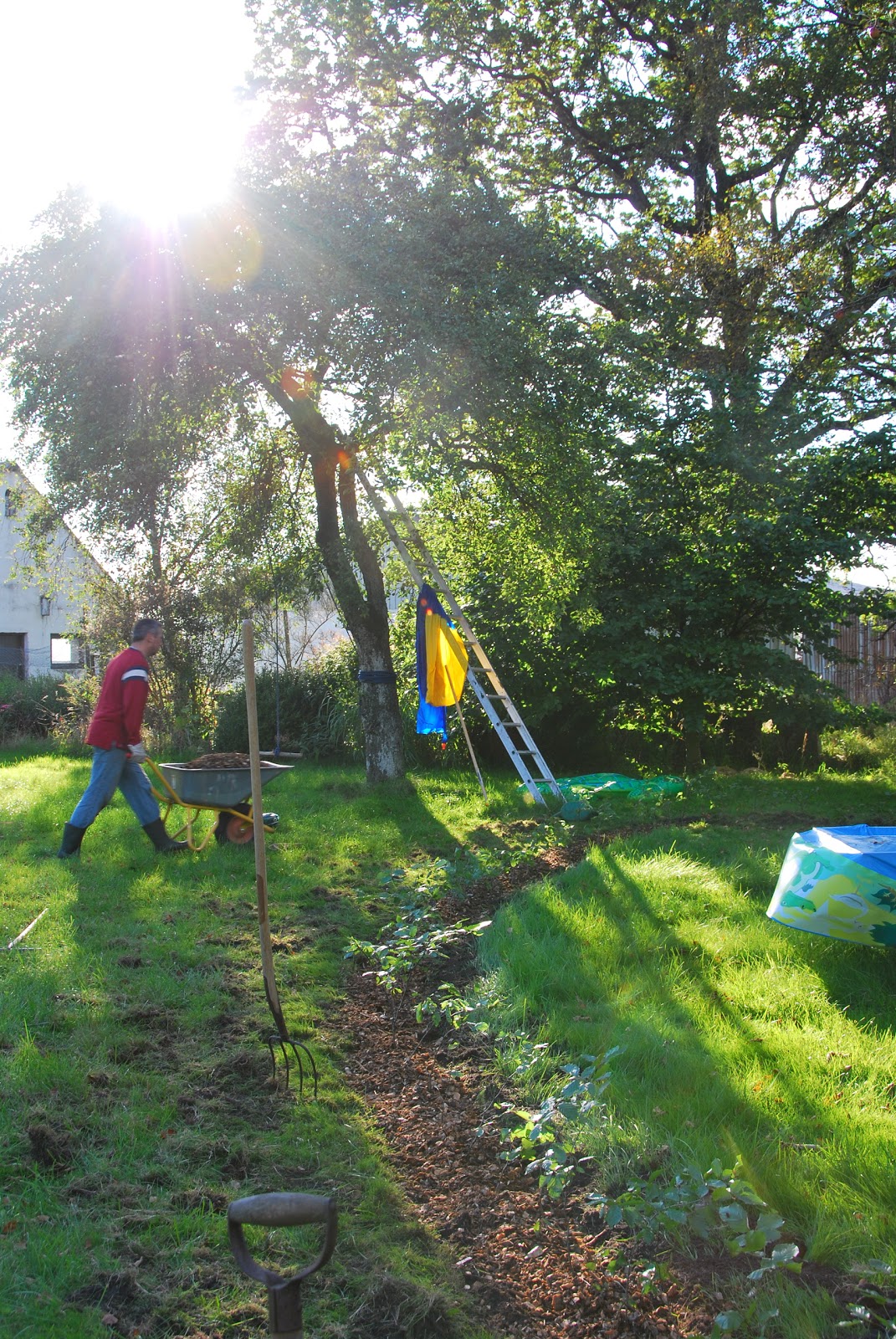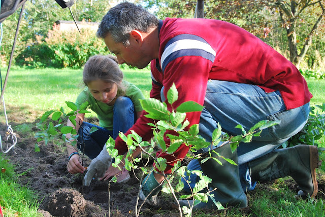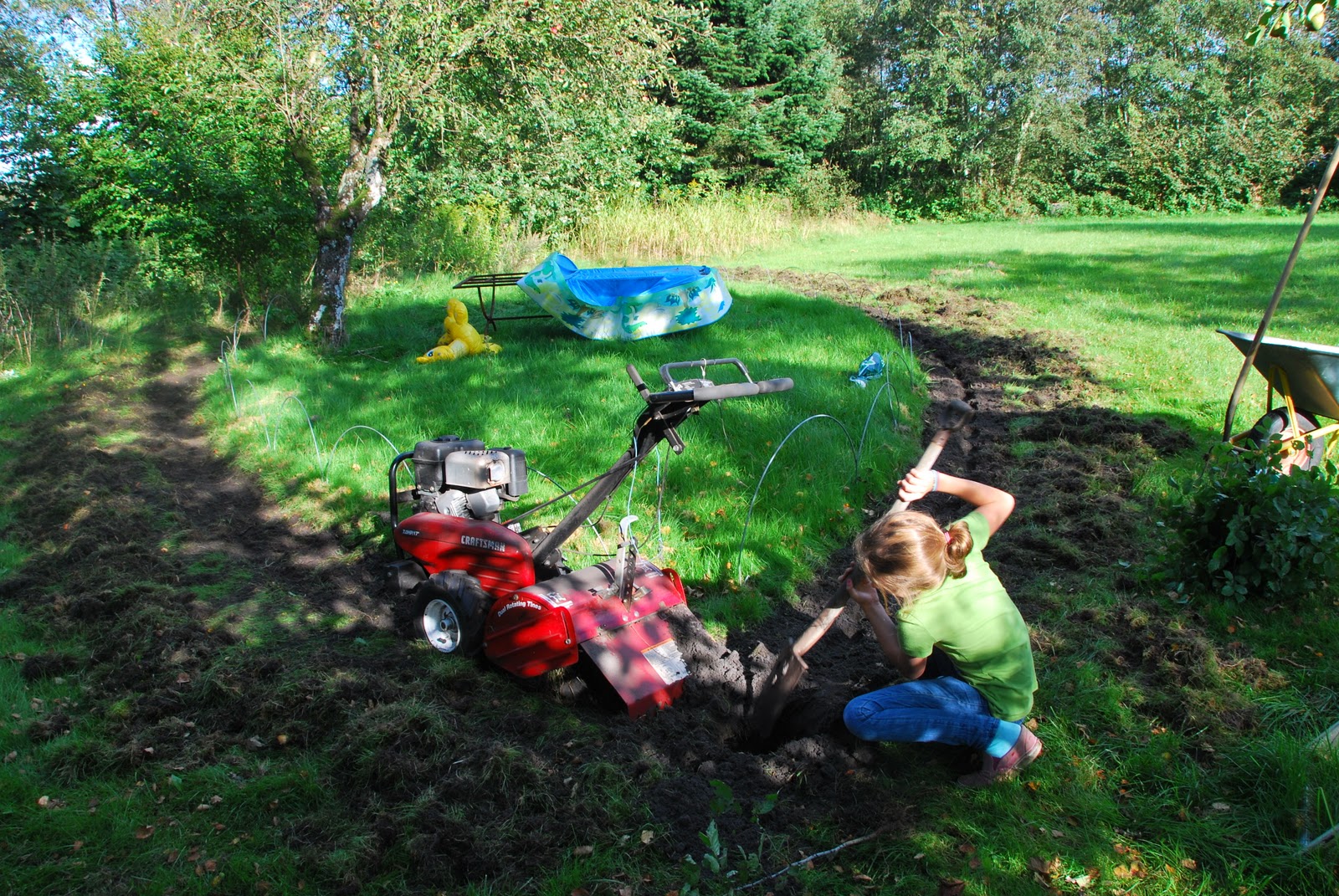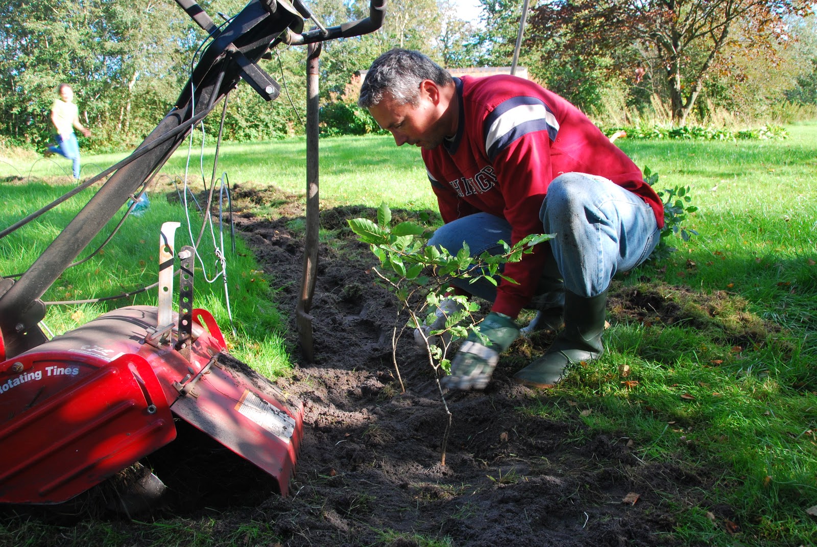 last sunday, we tilled up the form of the ship and planted a whole lot of little baby beech trees to begin the hedge. we hadn't gathered quite enough on our trip to the forest, so we're not done, but we got a good start. and it was a lovely afternoon.