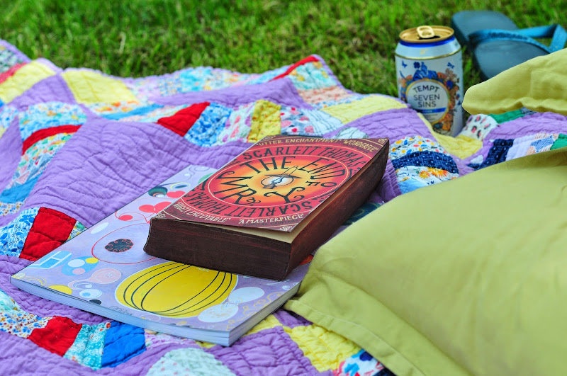 i read nearly anywhere (even sometimes while driving), but the best place is on a lazy summer day in the backyard of my falling down farmhouse out in the countryside. essential ingredients are a library book (of course), a hand-stitched quilt made by my great great grandmother annie back in the 1940s, a couple of pillows and a beverage. in this photo, a cider, but it could just as well be a cold glass of minted lemonade or a summery st. germain cocktail (we've jumped on the st. germain bandwagon around here). what's important is the scent of the lilac-drenched air, the song of the birds and the occasional cat stopping by to flop down in the shade. i can't think of a better place to read. come on by, bring your book, i'll make you a cocktail too...