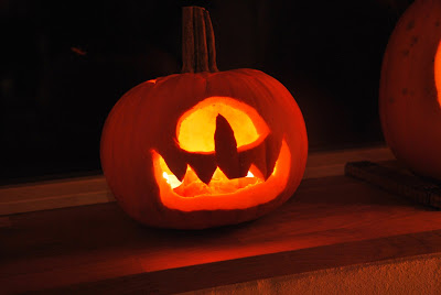 but, i can't wax philosophical all day. i have to prepare for 20 2nd graders to descend on us at 5 p.m. for a halloween party! the house has to be decorated, the pumpkin tops cut open (they're going to start off by carving pumpkins, tho' i am uncertain that giving sharp objects to 20 2nd graders is a good idea), warm beverages simmering on the stove, food and snacks prepared for the hungry masses, apples tied to a string for fun and games, i have to be in my modified morticia addams costume (i got a black & purple wig instead of black & grey). last night, we carved a couple of pumpkins to get ready: