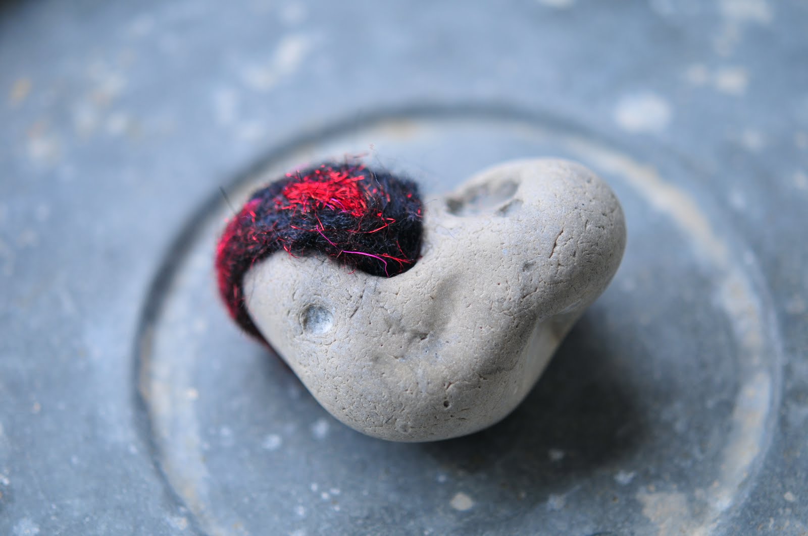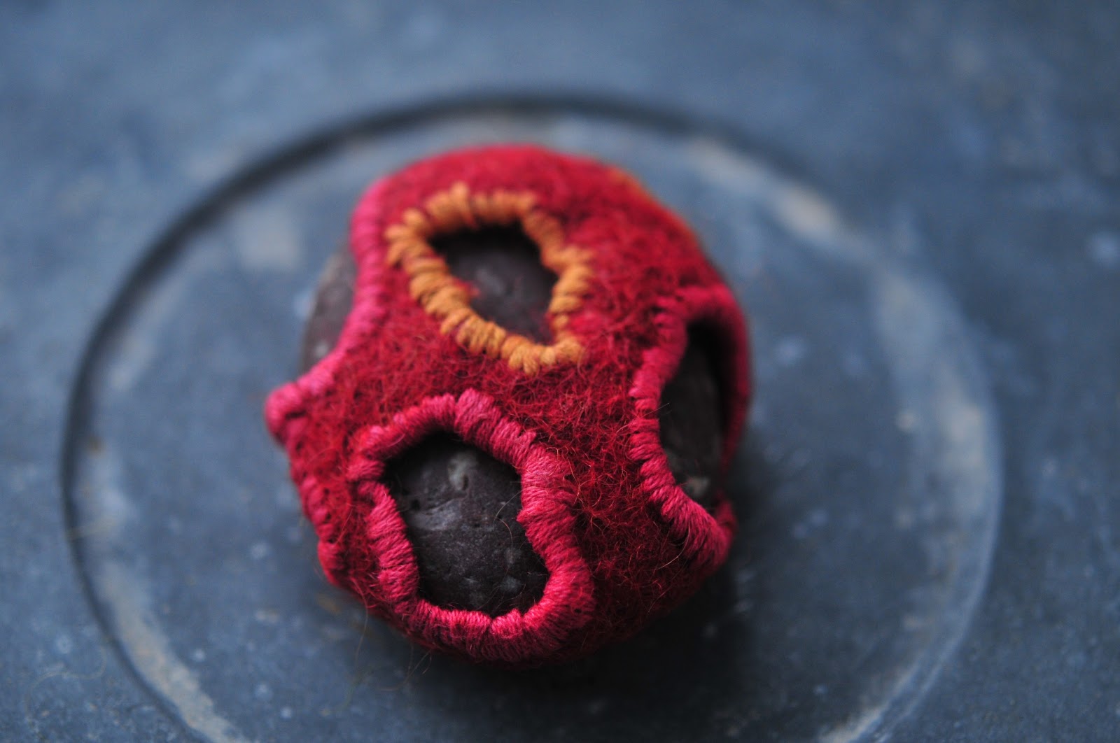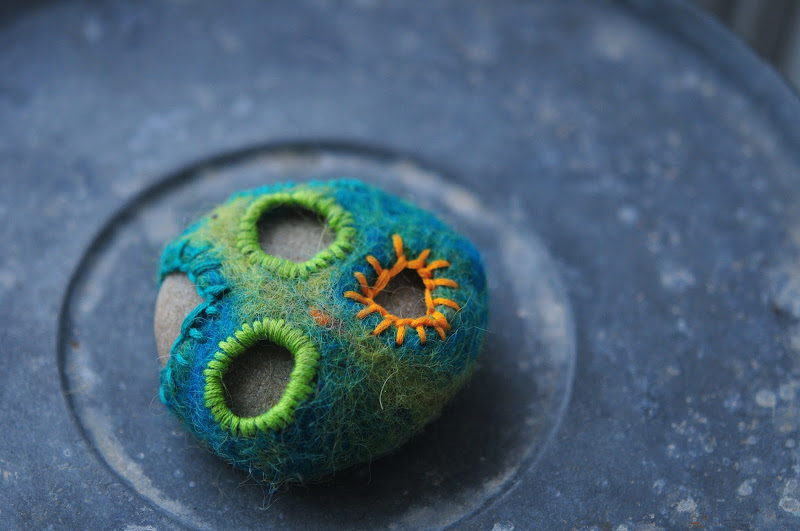 i'm learning a lot about different types of wool - this one got all stretched out as i stitched it, making the holes even bigger and becoming very loose on the stone. i had to felt it again to make it tight on the stone. i like the effect it made, with uneven, wobbly holes.