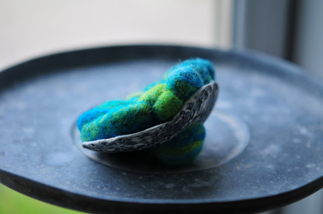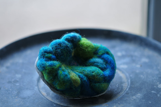 i saw felted stones last year on etsy and i can't locate the shop again, it was too long ago, i guess, tho' i vaguely recall it was based in the netherlands. i had ordered some beautiful rovings to use for felting, also nearly a year ago, but it took having this little resurrection fern merfish to push me to do it. for the inspiration to come forth. sometimes you just have to wait for these things to happen. i'm learning that.