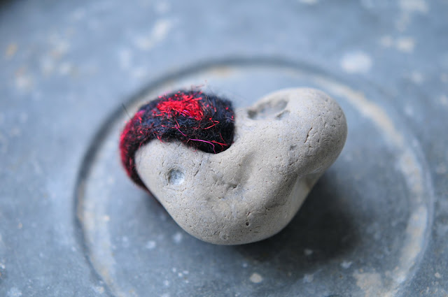 i've long had a thing about stones and we have many of them around the house, gathered on beaches all over the world. i even have a couple from a beach in oregon that my grandmother gathered thirty some years ago. so you can imagine i've had my share of overweight luggage fees because of schlepping stones back home from my travels.  i really love what margie has done with these stones. it's like she sees something in them and it's called forth by her crocheting. i get the feeling that the little flat stone WAS a merfish and margie saw that and just gave him his tail. these are THAT wonderful. and i don't know how to crochet, but i feel that having them near me on the shelf in my studio will spur some creativity in me in some way that i don't yet see. i think it will be something to do with combining natural and manmade materials, but i guess time will tell. but already, i made it a couple of friends--i felted some of the many stones that are lying around the house: